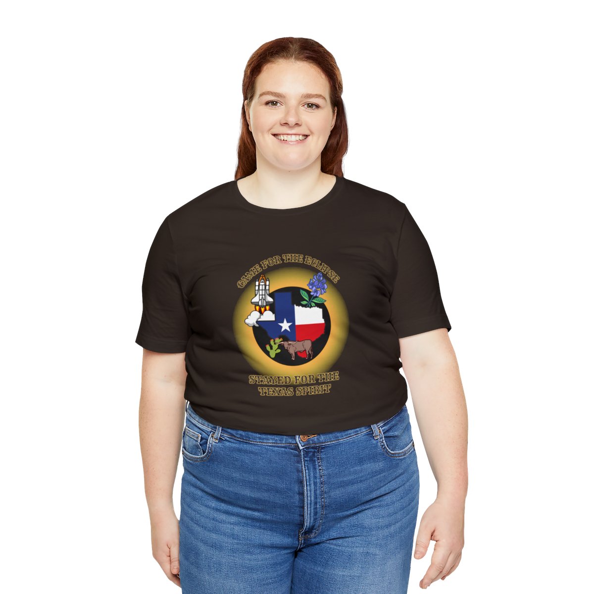 Celebrate an amazing celestial event and the Lone Star State’s enduring charm with our “Came for the eclipse, stayed for the Texas spirit” T-shirt. This unique design beautifully merges the awe of a total solar eclipse with iconic symbols of Texas, set against the backdrop of the state’s silhouette filled with the vibrant colors of its flag. The shirt features illustrations of bluebonnets, a launching space shuttle, a cactus, and a longhorn, each symbol representing the diverse beauty and pioneering spirit of Texas. It’s a tribute to both the once-in-a-lifetime spectacle of the eclipse and the timeless allure of Texas culture and hospitality.